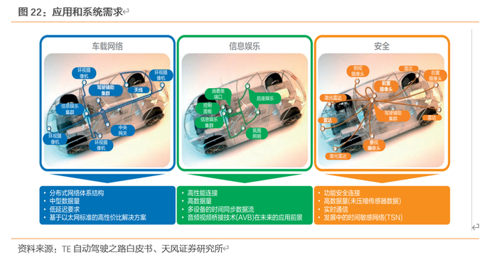 自动驾驶需求定义了建造自动驾驶车辆所需的功能、安全级别和整车架构,以及每个连接在架构中需求的实时设置、数据质量及速度要求。因此,每个单一连接的特性可能因连接节点的功能和安全级别而有所不同,可分为车载网络、信息娱乐、安全三类。