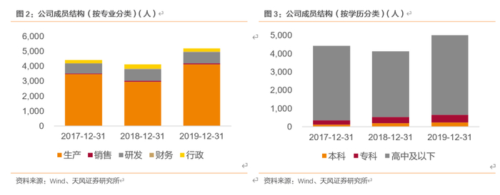 近三年,公司员工总数由4424人上升至5210人,其中,研发人员由668人上升至742人,占比小幅下滑,由15.10%下降至14.24%,系公司总人数增加。学历方面,近三年公司员工教育水平逐渐提高,公司本科、专科人才实现增长,并且本科与专科人才的占比分别从2017年的2.83%、5.27%增长至2019年的4.64%、8.06%。根据2020年中报,公司已拥有113项国内外专利,其中国内发明专利16项,实用新型专利80项,外观专利17项;境外专利6项,申请14项,相比2019H1,专利数量增加25项。因此我们认为,公司正在逐步实现转型,由劳动密集型企业转向技术密集型。
