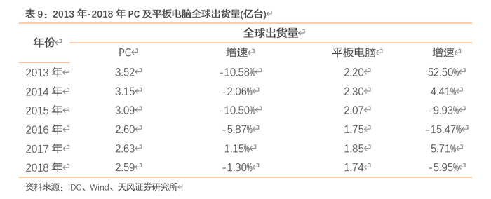 在移动智能终端的冲击下,国际PC产量持续萎缩,而平板电脑产量也经历了较大波动。2013-2018年,PC产量从3.52亿台下降到2.59亿台,平板电脑产量则依年为2.20亿台、2.30亿台、2.07亿台、1.75亿台、1.85亿台和1.74亿台。PC和平板电脑市场相关厂家因此也加速发展“二合一”式笔记本电脑的步伐。