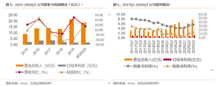 2014-2019年公司营收规模逐渐增大,实现“翻番”,2020Q1-Q3营收逼近2019全年业绩,归母净利润已超过19年,业绩增厚可期。公司20Q1-Q3毛利率与净利率稳步提升,毛利率分别为26.00%、31.50%、33.81%;净利率为3.59%、11.22%、13.99%,系公司降本增效,各项费用下降,公司盈利能力显著提高。
