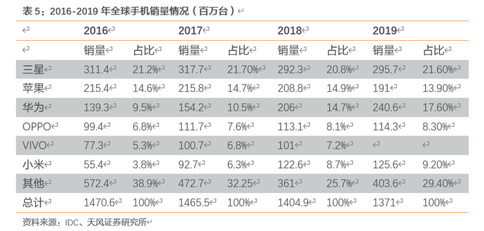 智能手机为连接器主要驱动力,受益全球智能手机集中度提升。公司现有下游手机终端客户为三星、OPPO、VIVO、小米和华为,是世界上主流的手机品牌。根据2016-2019年手机市场销量来看,全球手机市场销售正在往头部集中,前五大手机品牌销量占比为57.40%、61.30%、65.70%和70.60%。公司已经进入全球主流智能手机品牌供应链,成为华为、欧珀、步步高、中兴、三星、小米等全球知名智能手机企业的供应商,并且已进入闻泰通讯、华勤通讯、龙旗科技等国内知名智能手机设计公司。公司作为主流手机品牌的供应商,预计将持续受益智能手机市场的马太效应。
