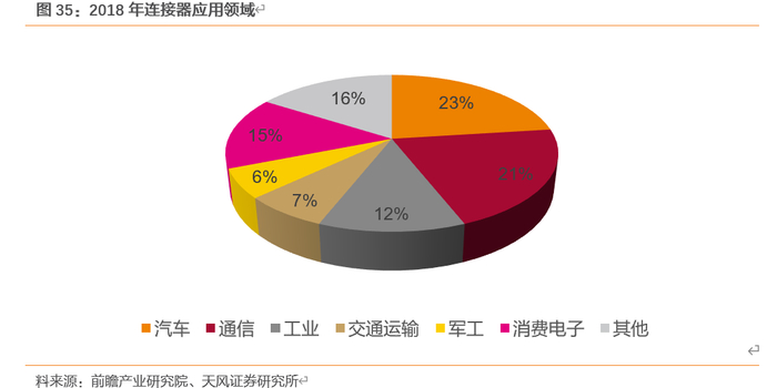 连接器的具体应用领域可划分为汽车、通信、工业、交运、军事及航天航空、消费电子等几大类。从2018年的情况来看,全球连接器市场中,汽车领域所占比重最大,为23%;其次是通信领域、消费电子、工业领域,合计占比达71%。