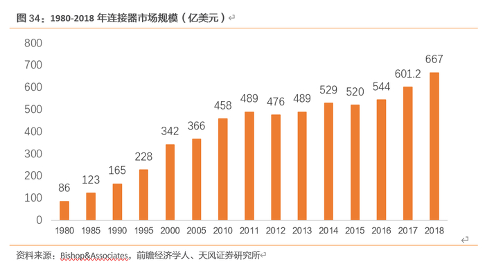 经过多年发展,连接器应用范围越来越广泛,在各类设备中成为能量、信息稳定流通的桥梁,总体市场规模基本保持了持续增长的态势。连接器的全球市场规模已由1980年的86亿美元增长至2018年的667亿美元,较2017年提升了11%,、自2012年以来年复合增长率约为5%。