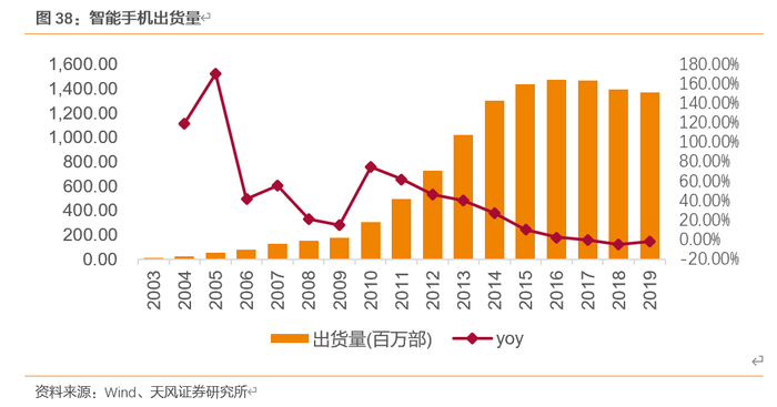近年来,全球智能手机市场景气度有所下滑,首次出现负增长。2013-2019年全球智能手机出货量由10.2亿部增长至13.71亿部。随着出货量基数增长到较高水平,智能手机出货量的相对增速将有所放缓,从2017年开始出现负增长。
