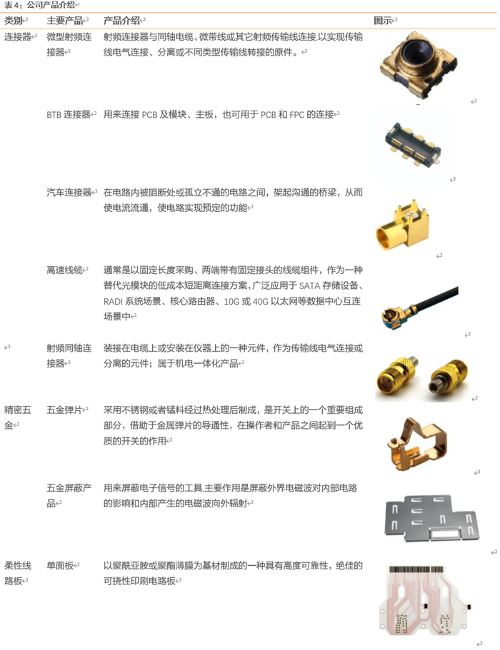 公司经营微型电连接器及互连系统相关产品,其中微型电连接器以微型射频连接器及线缆连接器组件为核心产品,包括微型射频测试连接器、微型射频同轴连接器及射频微同轴线缆组件,是智能手机等智能移动终端产品以及其他新兴智能设备中的关键电子元件;互连系统相关产品主要为电磁兼容件,是智能移动终端产品中起到电气连接、支撑固定或电磁屏蔽作用的元件。