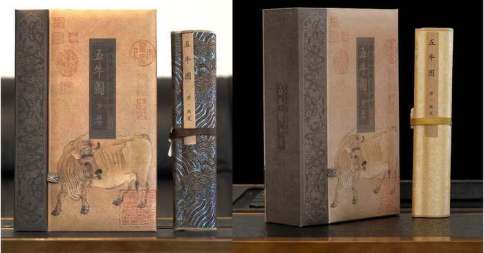 为了更好地方便大家自藏、赏阅和送礼,两组《五牛图》复刻画作均配备了礼盒包装。