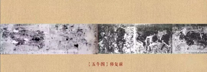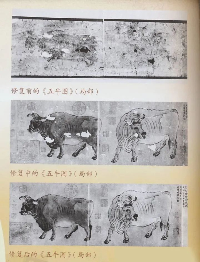 《五牛图》回归祖国时蒙满了尘垢,伤痕累累,更有大小洞蚀数百处,所以专家们首先面临的问题就是复原。
