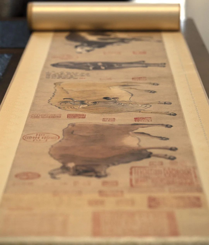为了更好地保护画作,两组《五牛图》复刻画作均特地采用了丝绢装裱。
