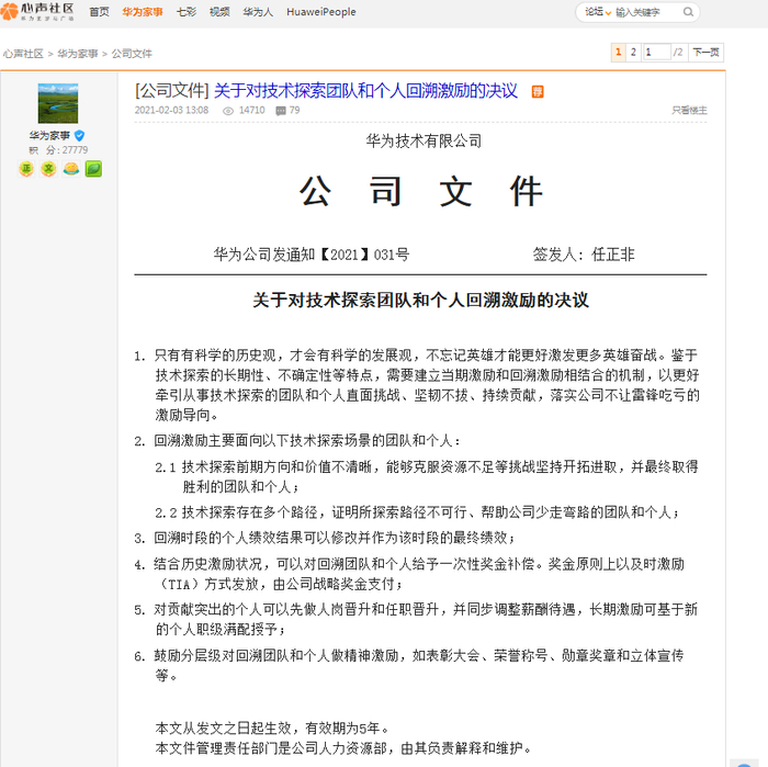 华为心声社区2月3日消息,任正非签发公司文件《关于对技术探索团队和个人回溯激励的决议》: