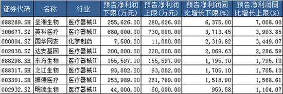 净利润规模最高的前十家公司中,医疗器械类公司占据一半,分别为英科医疗(68.00亿元至73.00亿元)、迈瑞医疗(60.80亿元至65.50亿元)、蓝帆医疗(30.00亿元至34.00亿元)、圣湘生物(25.56亿元至28.06亿元)、振德医疗(25.40亿元至26.18亿元)。
