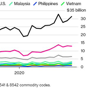 由于美国的禁令促使华为等公司的芯片备货,2020年中国芯片的进口额攀升至近3800亿美元,约占国内进口总额的18%。根据彭博社对官方贸易数据的分析,中国2020年从日本、韩国、台湾等地购买了近320亿美元的设备,用于芯片生产,比2019年增长了20%。