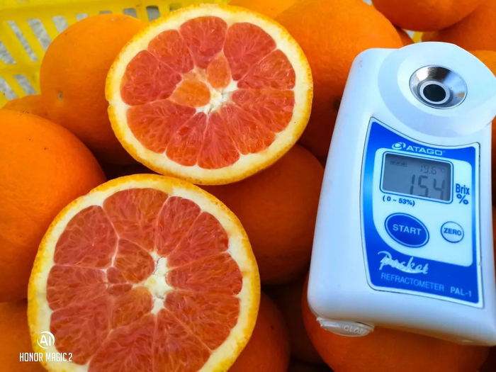 相比早早采摘售卖的橙,中华红橙经过10个月的挂枝,还有高温差的降霜覆雪后,它的蜜汁儿更是能让你的心都甜化了,用专业检测仪一测,不得了,都15°了!