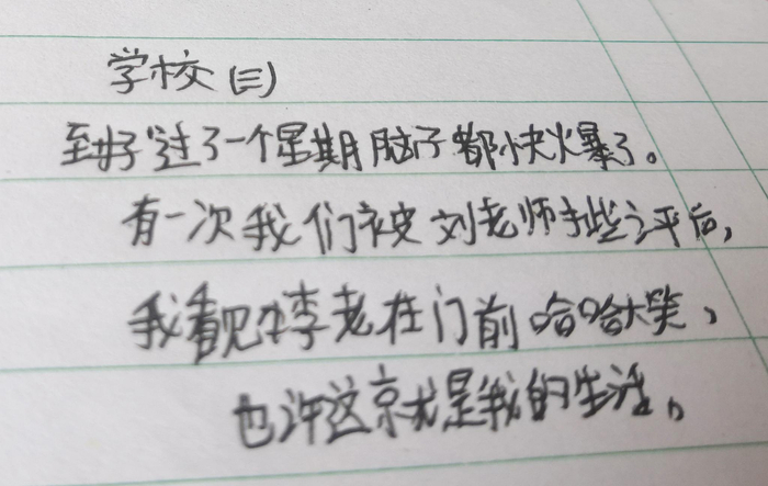 “老师站在讲台上,如同一只准备吃小绵羊的大灰狼,我们提心吊胆地坐在自己如同冰块的板凳上,如同一只弱小的小绵羊。我们这些弱小、可怜的小绵羊,一定要团结、互相帮助。”