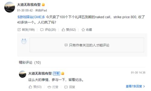 1月30日,他发文说,在几天前卖出100个下周五(注:2月12日)到期的naked call。