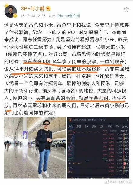 事实上,据何小鹏自己此前透露,自己曾在13,14年买了阿里的股票后一直持有;14年买了腾讯之后,也一直持有;18年买了小米之后,也一直持有。