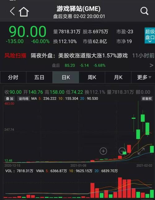 而截至2月2日收盘,游戏驿站的股价仅90美元,较高点已经跌去80%。