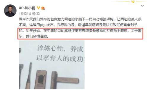 11月21日早上,何小鹏在微博上回应称,看来我们发布的包含激光雷达的小鹏下一代自动驾驶架构,让西边的某人很不爽。明年开始,在中国的自动驾驶你要有思想准备被我们打得找不着东,至于国际,我们会相遇的。”