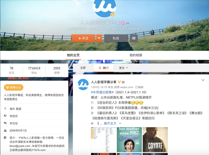 截止目前,人人影视字幕组的官方微博粉丝数已达771万,受众广泛可见一斑。