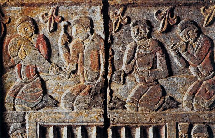 西安北周天和六年(571)康业墓具有胡人典型特征的画面有三幅,其中第四幅、第五幅、第六幅的线刻图,既有胡人出行图,也有胡雏伺候首领萨保饮酒场景,但这个胡雏正是剪发的头型〔图十六,图十七〕。
