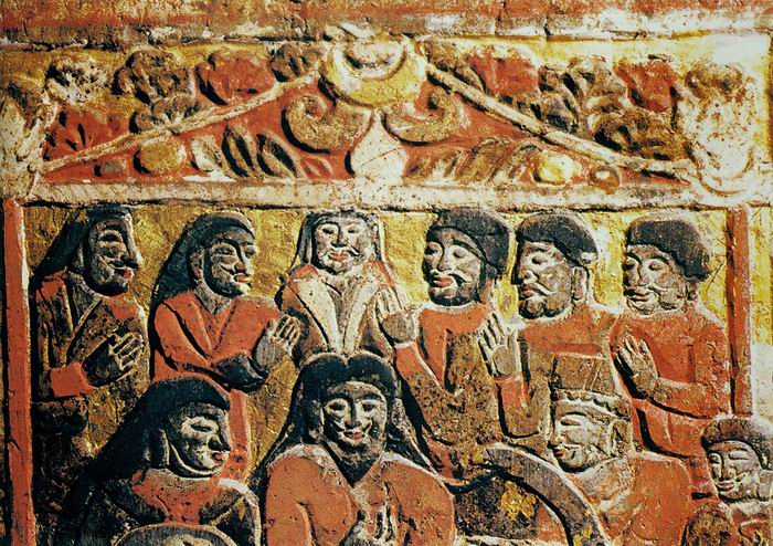 但是“剪头胡雏”究竟是怎样的形象,我们并不清楚。随着近年考古发掘中对胡人形象的新发现,我们可以辨认出,过去笼统地称为胡人的形象,其实是有区别的。先看山西5世纪北齐东安王娄睿墓中的陶塑与壁画。