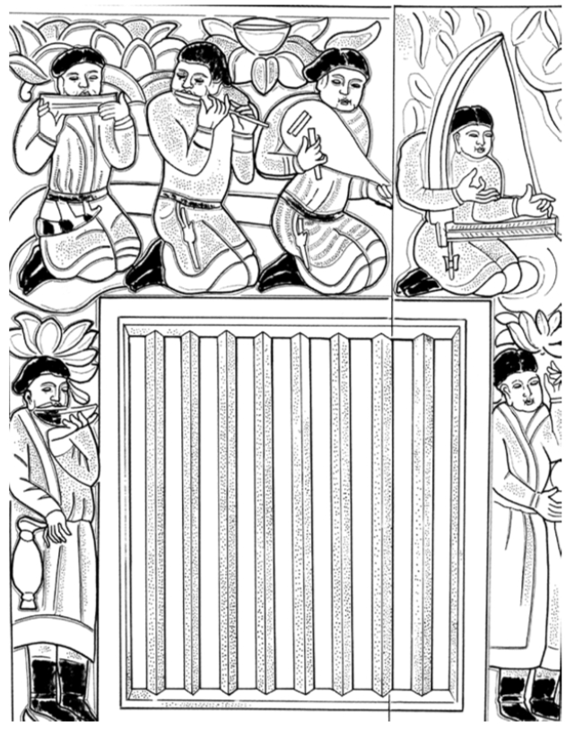 〔图十五〕西安北周张石安敬造释迦牟尼碑石刻胡人乐手线刻图