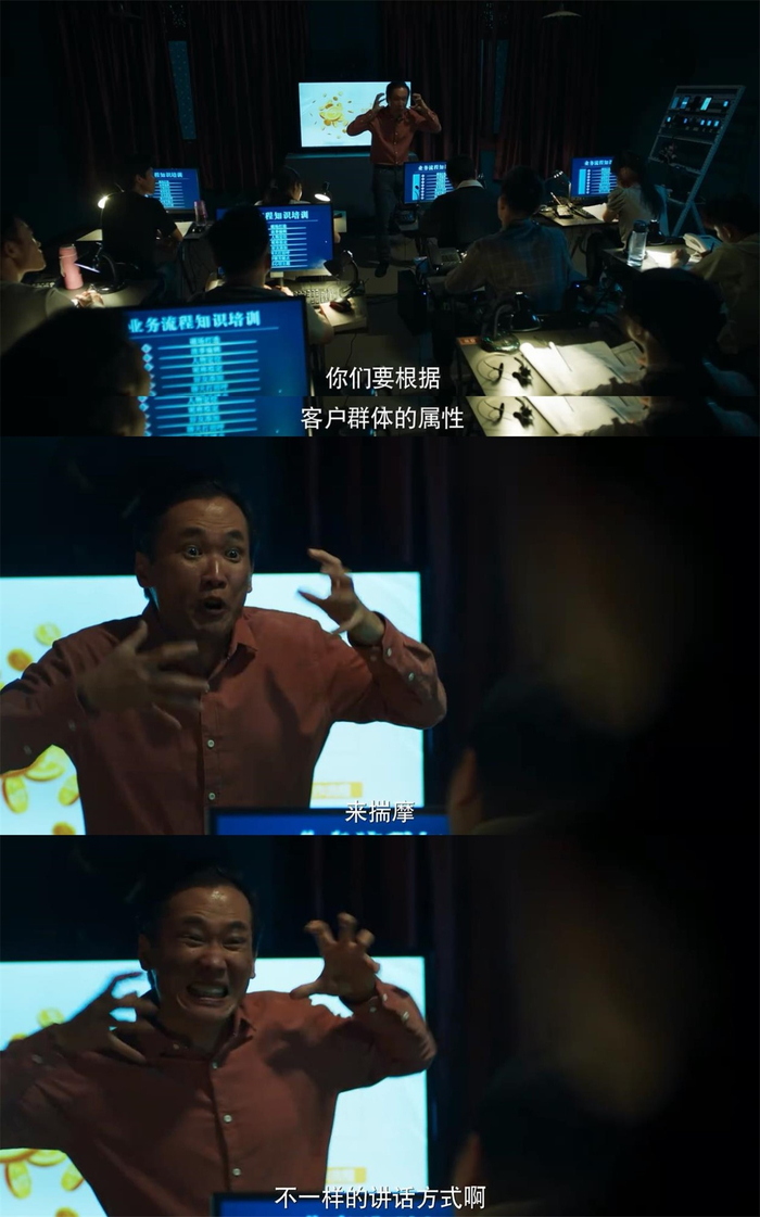 电诈篇与观众的生活更贴近一些,毕竟电信诈骗太普遍了。剧集揭示了诈骗团伙组织的严密、行动的快捷、手段的狡黠,也揭示了诈骗的完整环节:你的信息怎么泄露的、他们又是怎么精准实施诈骗的(不同的人有不同的诈骗剧本)、诈骗过程中犯罪分子又是如何分工的。观众首先可以把这部分当做科教片。