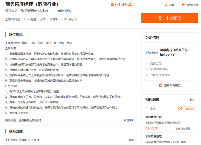 而环球旅讯在某招聘平台上发现,目前哈啰出行正在招聘酒店行业的商务扩展经理,要求具有3年以上酒店相关行业商务拓展工作经验,具体任职要求为: