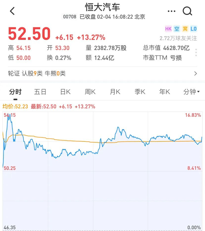 受此利好影响,2月4日,继市值突破4000亿港元大关后,恒大汽车股价盘中一度涨近17%,报54.15港元,再创历史新高。