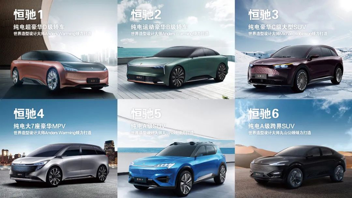2020年8月3日,恒大史无前例的一口气发布了6款新车。包括恒驰1、恒驰2、恒驰3、恒驰4、恒驰5、恒驰6,全面覆盖了A到D级所有级别,以及轿车、SUV、MPV、跨界车等全系列车型。