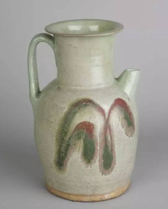 唐长沙窑“此是饮瓶不得别用”褐绿彩摩竭云纹瓷壶