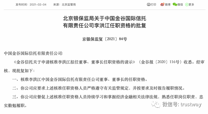2月4日,据北京银保监局公布的批复文件,金谷信托董事长李洪江的任职资格于近日获得该局核准。这意味着,此前董事长和总经理多年稳定不变的金谷信托,继去年新任总经理获批后,又迎来了新的董事长。