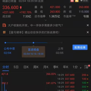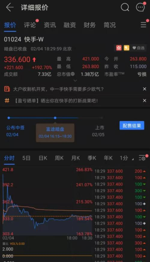 2月4日下午4点多,快手进行暗盘交易,富途证券信息显示,快手开盘大涨报263.8港元/股,最高涨至421港元/股,较发行价115港元/股的涨幅超266%。随后快手股价震荡走低,波动较为剧烈,截至6点半收盘,快手报336.6港元/股,涨幅收于192.70%,总市值达1.38万亿港元,成交额为7.33亿港元。据了解,快手已经超过农夫山泉(港股09633)、蓝月亮、泡泡玛特(港股09992)成为富途暗盘成交额排行榜第一名。