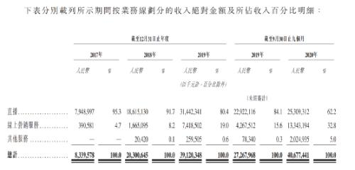 从快手的业务来看,直播收入保持增长,线上营销服务等其他业务的收入增长迅速。招股书显示,2017年、2018年及2019年,快手直播赚取的收入分别为79亿元、186亿元、314亿元,分别占总收入的95.3%、91.7%、80.4%。2020年前9个月,其直播收入为253亿元,占总收入的62.2%%,可见虽然现在直播仍然是快手收入的大头,但是比例在逐步降低。