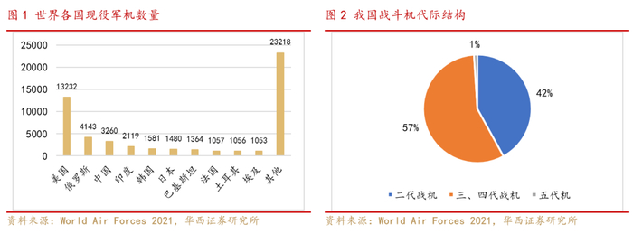 我国军用飞机代际结构与美国存在较大差距,存在结构性升级换装的需求强烈。根据World Air Forces 2021数据,目前我国战斗机以歼7、歼8 为代表的二代机存量占比仍达42%,而美国空军二代机已经基本退役,目前已经形成以F15、F16等四代机为主,F22、F35等五代机为辅的格局,四代机和五代机的占比分别为85%和15%。根据《新时代国防白皮书》指引,我国将加大淘汰老旧装备力度,逐步形成以高新技术装备为骨干的武器装备体系。“十四五”期间将是我国军用飞机结构性升级换装的新时期,四代机基本完成对二、三代机的替代,成为空军战斗机主力,五代机占比也有望迎来提升。