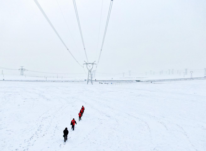 2月3日,清晨的阳光洒向银装素裹的锡林郭勒大草原,立春已到,本该回暖的天气却不见抬头,新一轮的寒流侵袭着茫茫旷野,气温始终维持在零下28度左右。在一望无际的雪地上,一抹红色点缀着冰雪世界,显得格外耀眼。这是国网蒙东电力共产党员服务队队员项羽和董帅正在巡视内蒙古特高压电力外送通道——锡盟——泰州±800千伏特高压直流输电线路。
