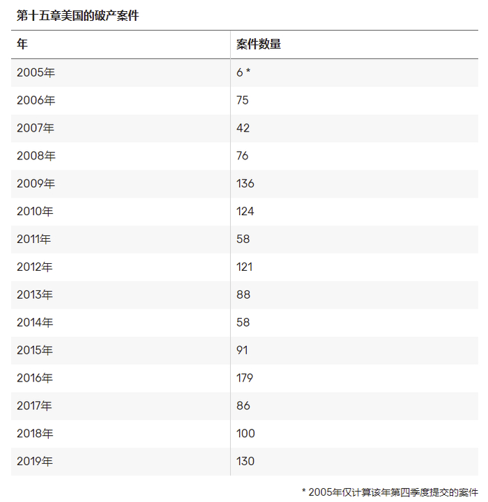 数据显示,截至2019年底,2009年、2016年和2019年提交的第Chapter 15破产案件数量最多。在2020年春季,许多外国公司因新冠疫情受困也纷纷申请第15章破产,如法国媒体公司Technicolor SA、加拿大茶叶经销商DAVIDsTEA、澳大利亚航空公司维珍澳大利亚航空、加拿大马戏团太阳马戏团娱乐集团等赫然在列。