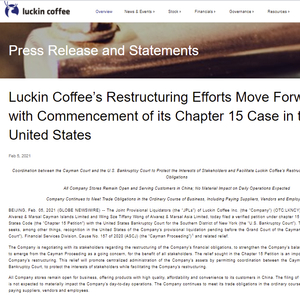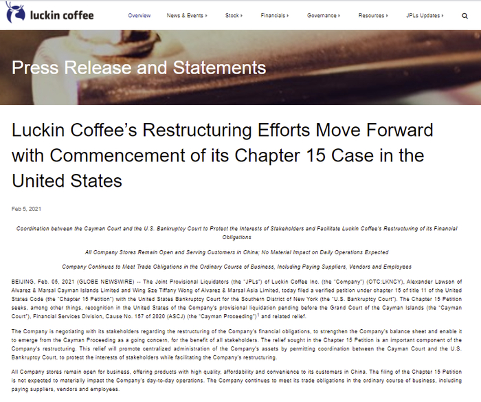 2月5日,瑞幸咖啡(LKNCY.O)在公司官网发布了公司正申请破产保护的公告。该公告称,公司根据《破产法》第11篇第15章(Chapter 15 Petition)向美国纽约南区破产法院提出申请。目前公司正在与其利益相关者就公司财务重组进行谈判,通过加强公司的资产负债表,使公司能够继续经营,同时为所有利益相关者谋利益。