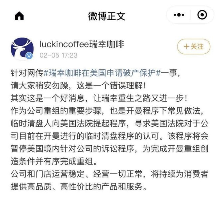 2月5日午后,瑞幸咖啡在其官方微博上称,申请破产保护是错误的理解,“其实这是一个好消息,让瑞幸重生之路又进一步!”
