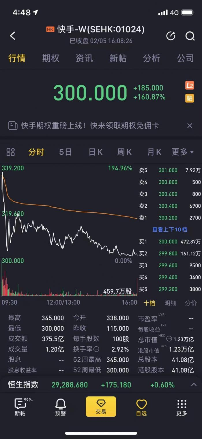 富途证券数据显示,截至暗盘交易结束,快手在富途暗盘收涨192.7%,报336.6港元,成交额达7.33亿港元,登顶富途暗盘成交额榜单。盘中最高涨幅至266%,达421港元。此外,根据富途暗盘,快手暗盘交易曾涨超267%,公司市值一度达至1.6万亿港元,在所有港股中排名第六位。