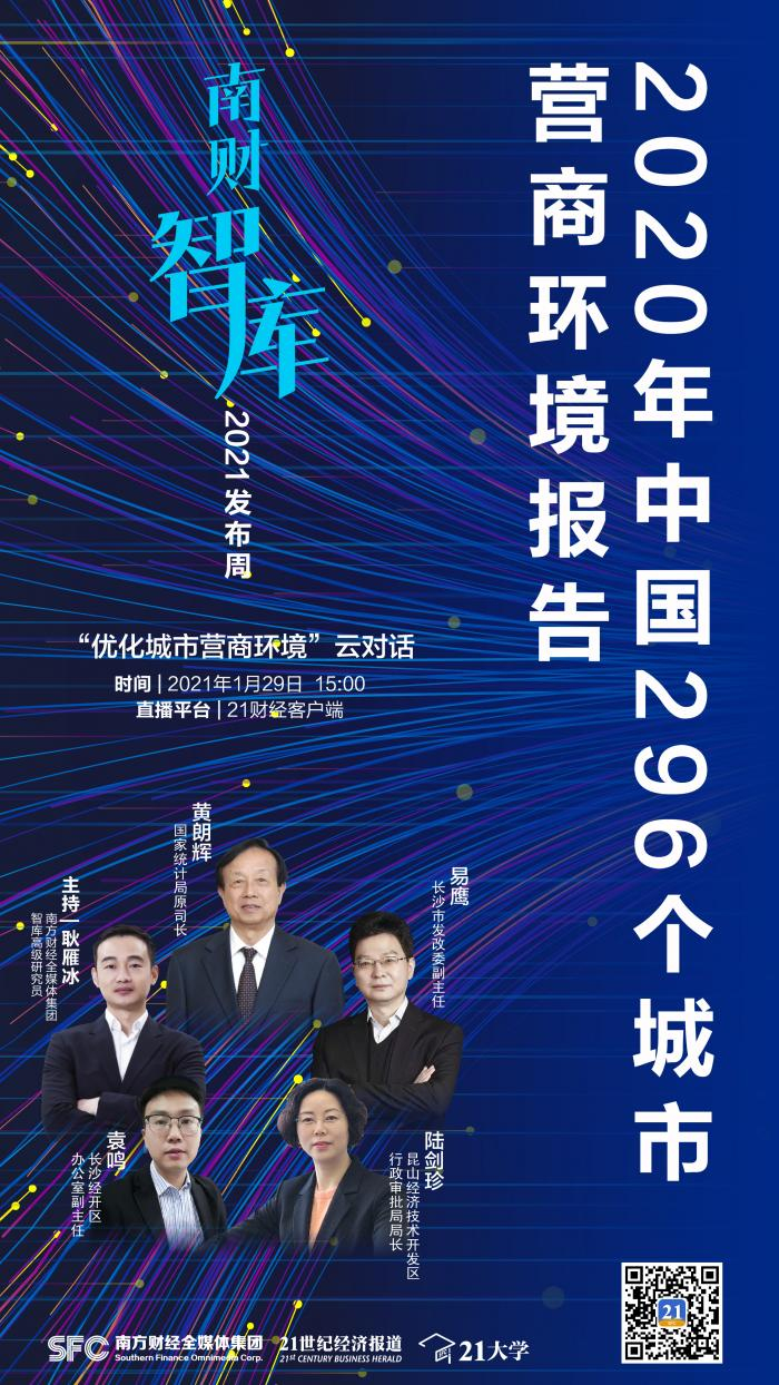1月29日,由南方财经全媒体集团主办的智库发布周之“优化城市营商环境”云对话召开,正式在线发布《2020年全国296个城市营商环境报告》。与会嘉宾国家统计局原司长黄朗辉、长沙市发展改革委副主任易鹰、昆山经济技术开发区行政审批局局长陆剑珍与长沙经济技术开发区办公室副主任袁鸣结合实际工作,分享了优化营商环境的案例与经验,并就双循环新发展格局下优化营商环境的改革重点进行展望。