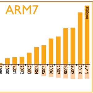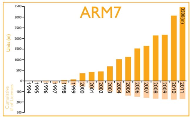 以ARM7这款芯片IP为例。2007年以后,ARM7授权的许可证数量基本没有变化,ARM也早已停止了对这款芯片IP的支持。但截至2011年,使用该IP的芯片出货量仍在快速增长,相应会给ARM带来版税收入。相对应的,作为芯片IP的购买方,在芯片量产多年后还在给ARM公司“交税”。而上交给ARM公司的特许权使用费持续得时间越久,对于IP设计公司而言成本也就越高。