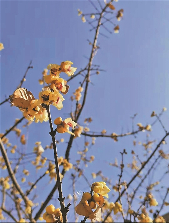 苏东坡的一句“风泉两部乐,松竹三益友”,据说是“岁寒三友”的由来,指的正是枝叶常青的松柏、经冬不凋的竹子和傲霜开放的梅花。但当年苏东坡在黄州东坡种地种花、围墙建房,地处中原,从地理位置来看,既是蜡梅主要分布地段,又是梅花繁盛之地,如果正如那个典故中所描述,友人是春天来拜访,那么当时看到的就可能是春梅,即梅花;但如果揣测苏东坡所指喻意,能与经冬不凋的松竹一样傲雪不败,保持着寒士高洁品性的,倒更像是蜡梅。