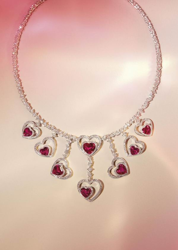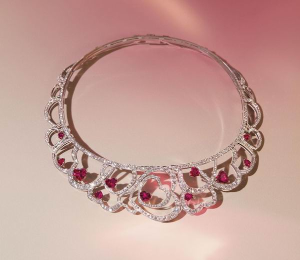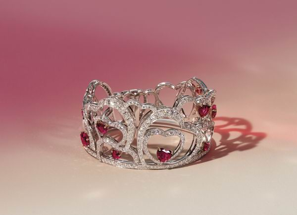 “Glamorous”珠宝套系则由6件组成,创意十足。钻石排列而成的弧形交错线条与心型打造出的柔美耀眼的钻石缎带,镶嵌恰如其分的红碧玺,映衬出迷人风韵。这款项链仿若一条钻石蕾丝,随着佩戴者的心跳节奏婆娑律动。该作品共镶嵌659颗钻石(共重23.60克拉)及11颗红碧玺(共重14.60克拉),由工匠耗时340多个小时精心雕琢而成。同套系手镯、耳环以及两枚胸针也展现出标志性设计的无尽魅力,其戒指则以灵动的心型与另外一个可摆动的心型完美融合,在指间绽放风华,可单指或双指佩戴,旨在致献20世纪60年代的花形胸针。