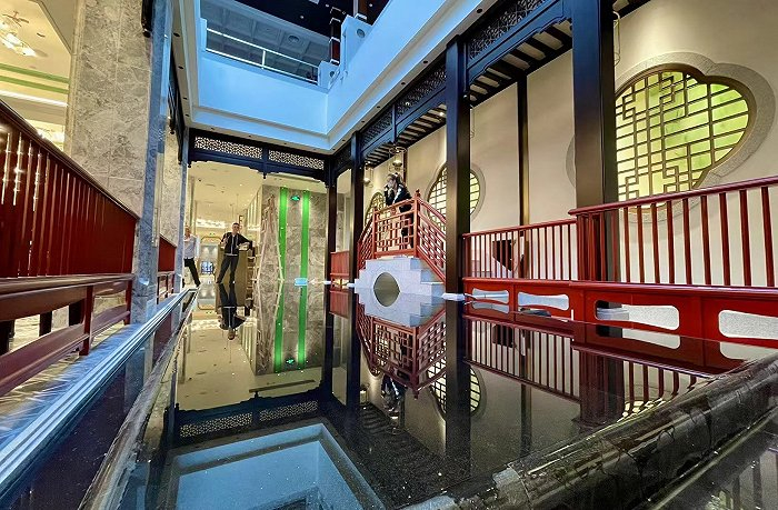 为了还原百年前陶陶居的风貌,设计团队收集旧照片、走访陶陶居老员工,将不少旧日物件都被保留与修复,比如红木花窗、金丝喜鹊栖木棉挂落等,以重构清末民初的建筑。同时,也加入了现代中式风格元素,如流光溢彩的大吊灯,灰色大理石的地面和墙面等。