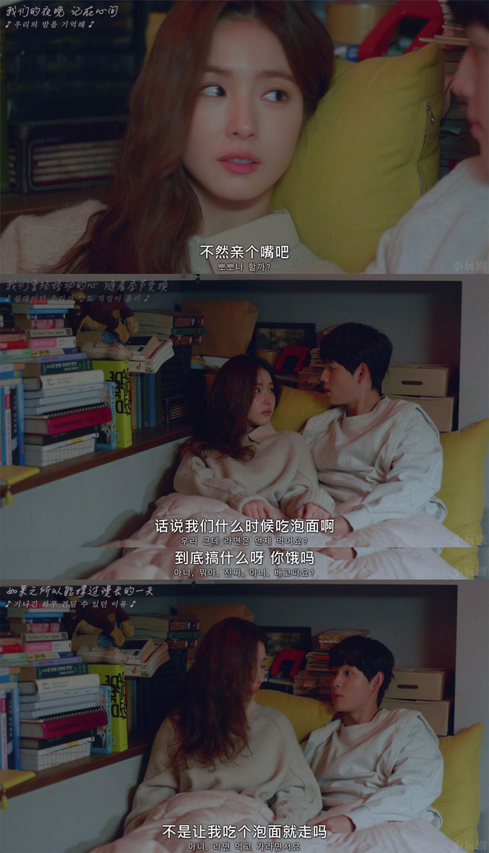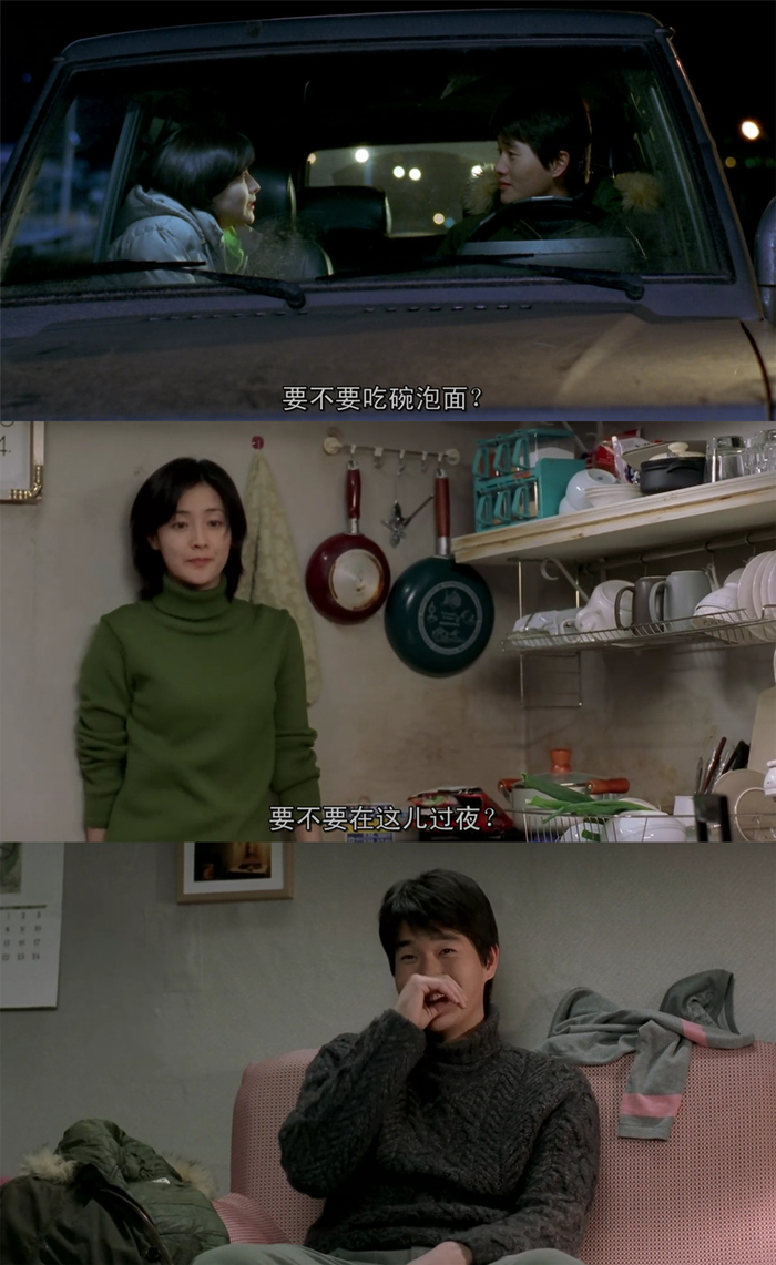 这里致敬的是李英爱、刘智泰主演的电影《春逝》中的经典“拉面梗”,女主邀请男主回家吃拉面,吃着吃着,“小坐就变成了小住”。之后,韩国影视作品中,经常出现以“要不要吃拉面”来含蓄表达“要不要过夜”的邀约。