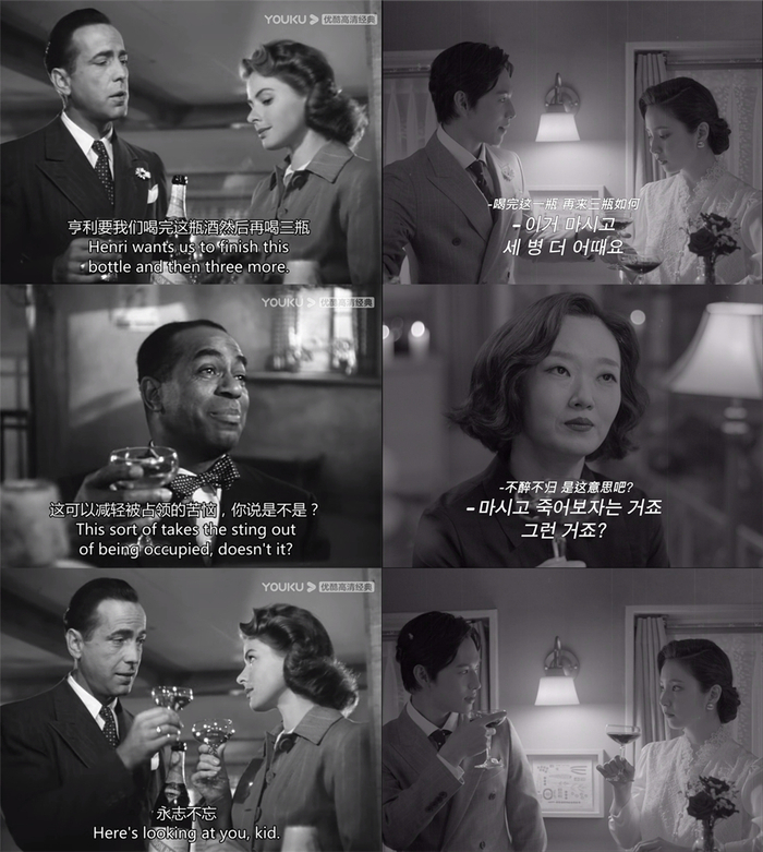 善谦到美珠家借住的第一晚,美珠脑补的幻想小剧场,致敬了《卡萨布兰卡》(Casablanca)。