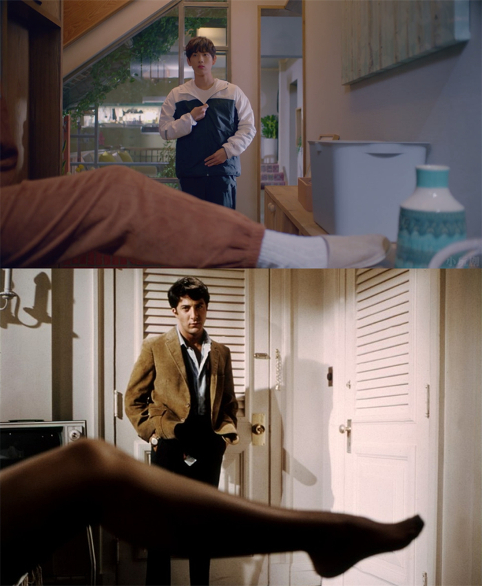 把熬夜刻在脑门上的美珠,特地倒了“时差”陪善谦晨跑,在玄关处等他的镜头,致敬了《毕业生》(The Graduate)。
