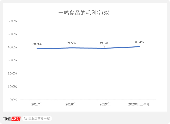 一鸣食品的毛利率从2017年的38.9%略微上涨至2020年上半年的40.4%,和加盟店渠道的毛利率较为接近,且变动基本不大。