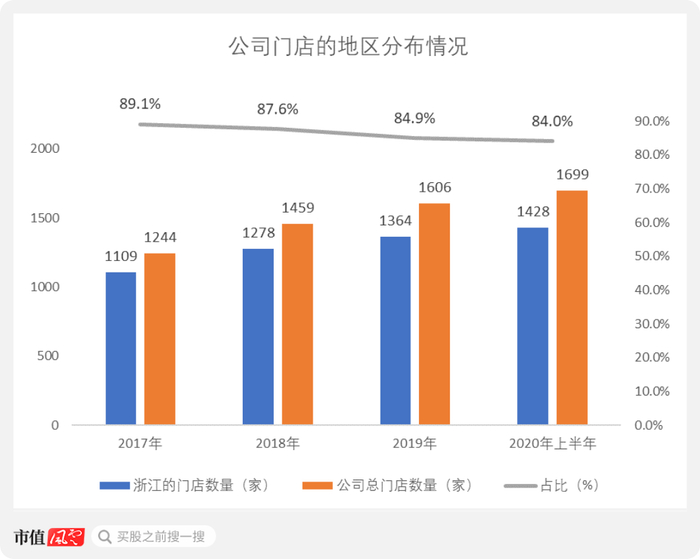 一鸣食品总的门店数量,从2017年的1244家增长至2020年上半年的1699家,同期,位于浙江的门店数量则从1109家增长至1428家,公司80%以上的门店,都是开在浙江。