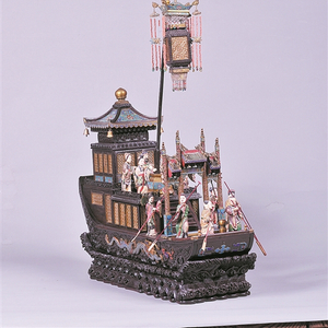 广州博物馆所藏的清代紫檀嵌珐琅雕塑人物楼船,用料名贵,雕工精美,是难得的紫檀木雕楼船精品。